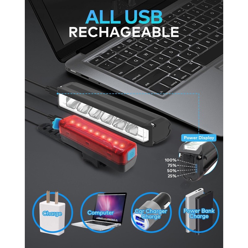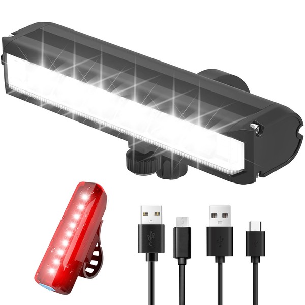 - USB TYPE C RECHARGEABLE: Using the USB TYPE C charging interface, charging is more convenient. Both USB Rechargeable Bike light front and back can charge from mobile phone charger,computer,power bank or any device with a USB port.Besides being used as a bicycle light, you can also use it for night running, camping, fishing, night work and activities.