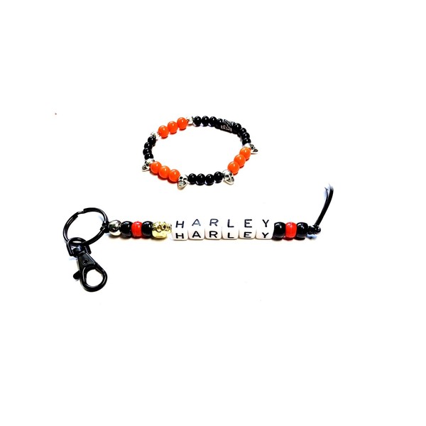Biker Black and Orange Skull Beaded Bracelet and Matching Keyring