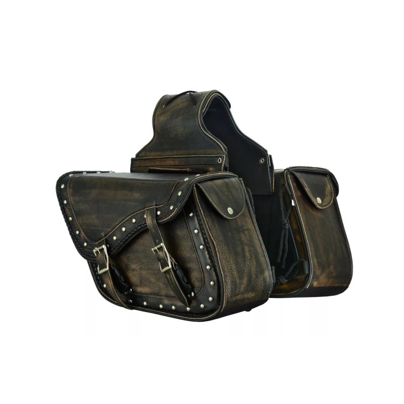 Biker Leather Motorbike Distressed Brown Leather Saddlebag Studded &Braided Motorcycle Luggage