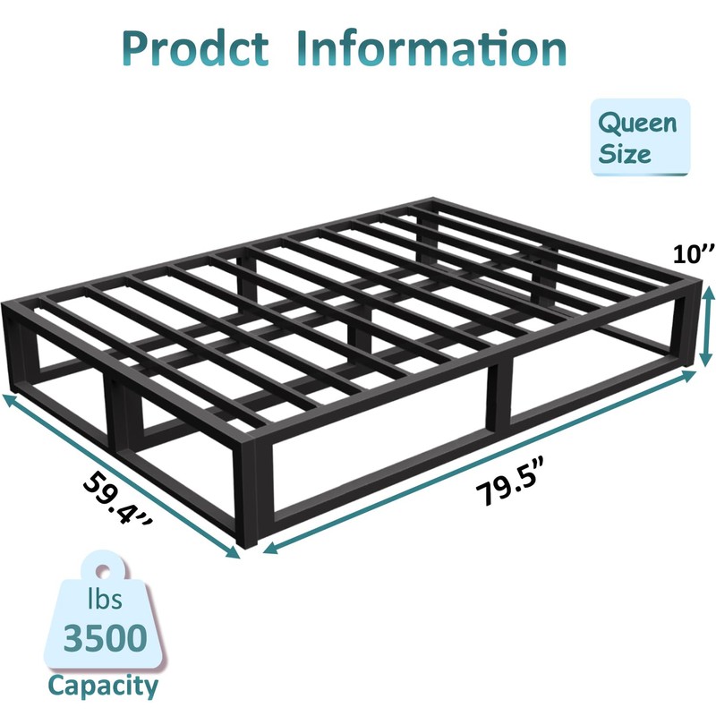 - 【Sturdy and Durable】This 10 inch queen bed frame is made of steel slat construction and noise free design, stable and durable, no squeak, can support 3500 lbs. The minimalist design coordinates easily with modern decor.
