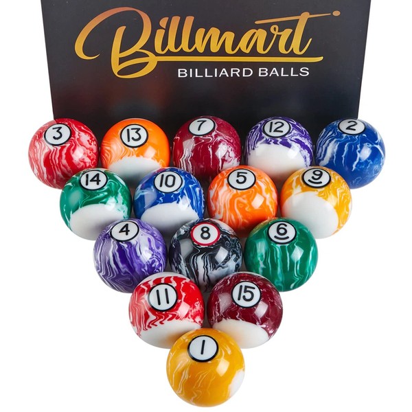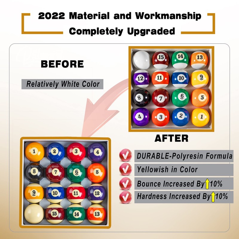 - 【2022 New Upgraded】: 2022 Billmart Pool Table Balls are completely upgraded from Material and Workmanship, crafted from high quality grade DURABLE-polyresin formula, Yellowish in color, Bounce and Hardness increased by 10%, more durable.