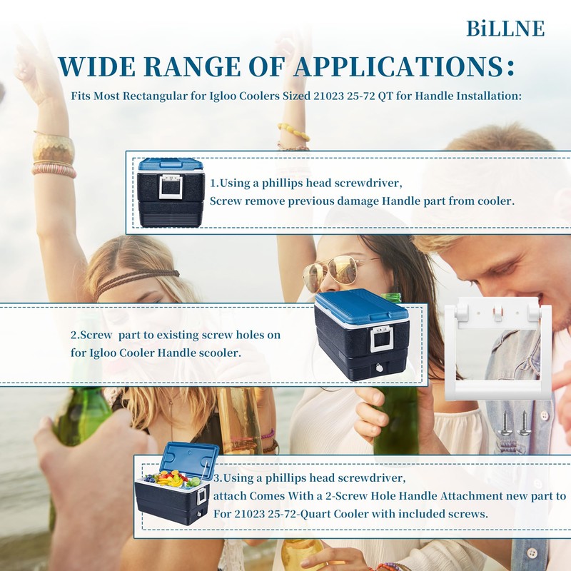 - Suitable for: travel,camping,beach,reunion,Fits Most Rectangular Igloo Coolers Sized 21023 25-72-Quart 2 Pcak Cooler Handle Replacement Parts And Comes With a 4-Screw Hole Handle Attachment. The Square White Swing Handle Can Swing Upward, Making It Easy To Carry And Travel.