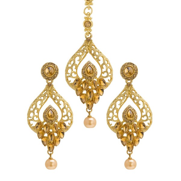 Bindhani Golden Stone Small Filigree Style Maang Tikka & Indian Earrings For Women