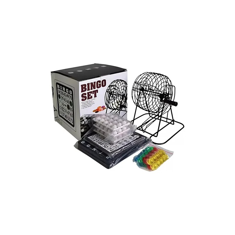 Juego Bingo completo con 246 piezas, incluyendo tómbola, bolas, tarjetas, fichas y tablas.
