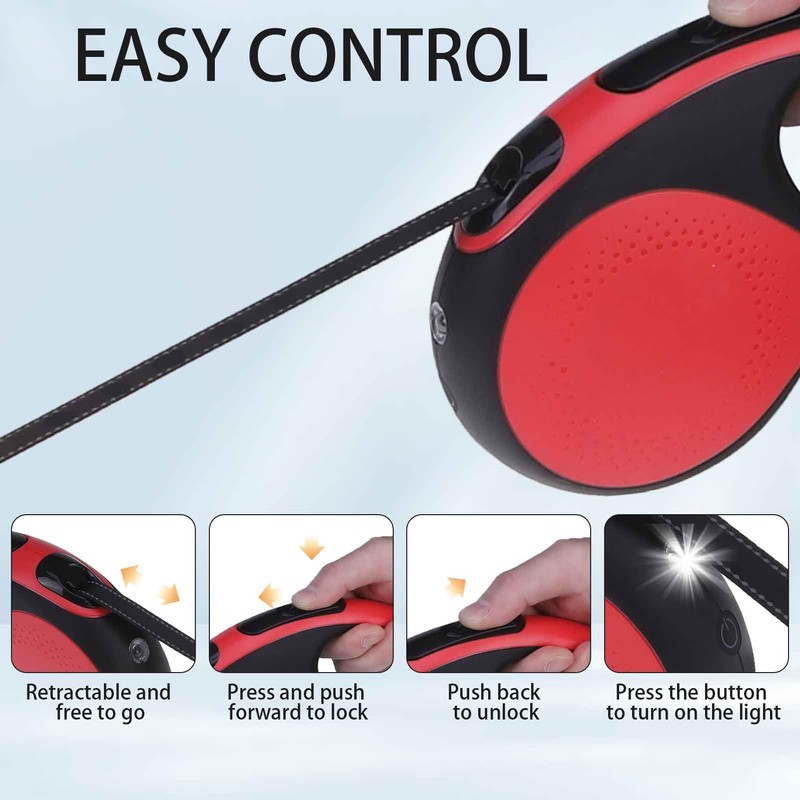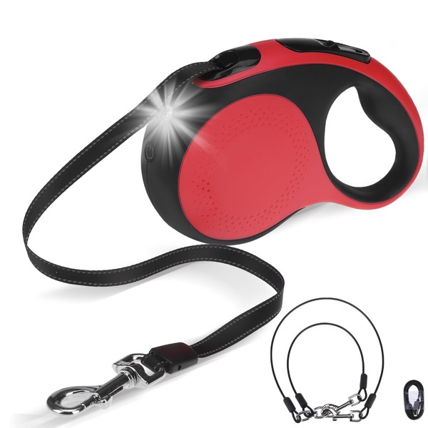 - LED SEARCHLIGHT & REFLECTIVE ROPE DESIGN: This heavy-duty retractable dog leash with bright LED light is perfect for taking your dog outside at dusk or night. What's more, the black strong nylon rope with embedded reflective lines and two silver wire ropes are also reflective to ensure the safety and visibility of walking your dog when visibility is low. Complimentary USB cable, no battery required, environmentally friendly