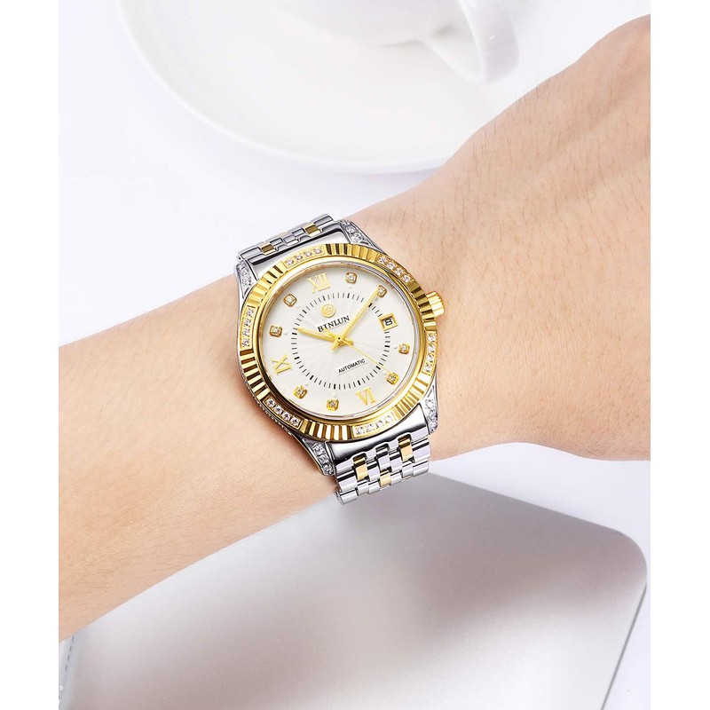 BINLUN Men's Watch, Automatic Mechanical Watch, Luminous Date Display, Diamond Luxury Watch, Simple, Elegant, Fashionable, gold silver & mens, Bracelet Type