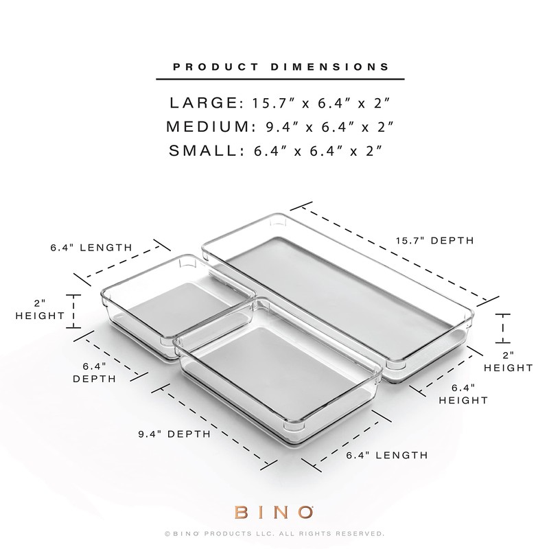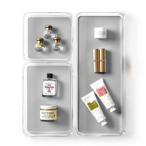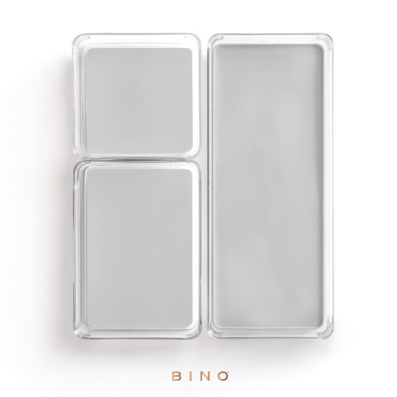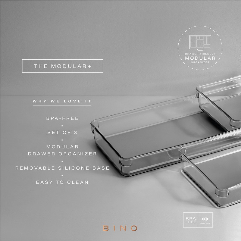BINO | 3-Piece Drawer Organizer Bin Set - Grey, Large | THE MODULAR+ | Multi-Purpose Storage | Soft-Grip Lining and Non-Slip Rubber Feet | Durable | BPA-Free | Desk Drawer Organizer | Vanity Organizer