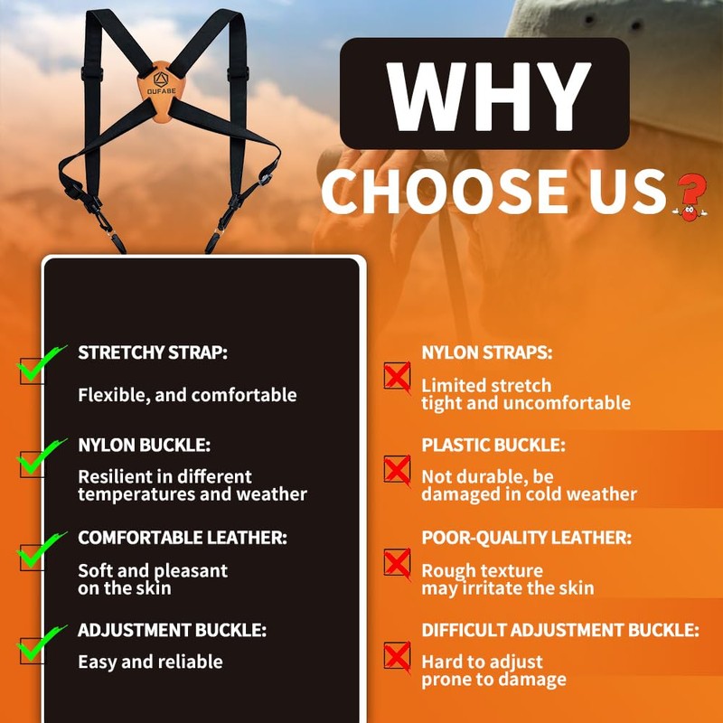 - EASY TO OBSERVE - Oufabe binocular harness strap keep the binoculars close to the chest, you can easily slide the binoculars into the observation position without any interference to your operation