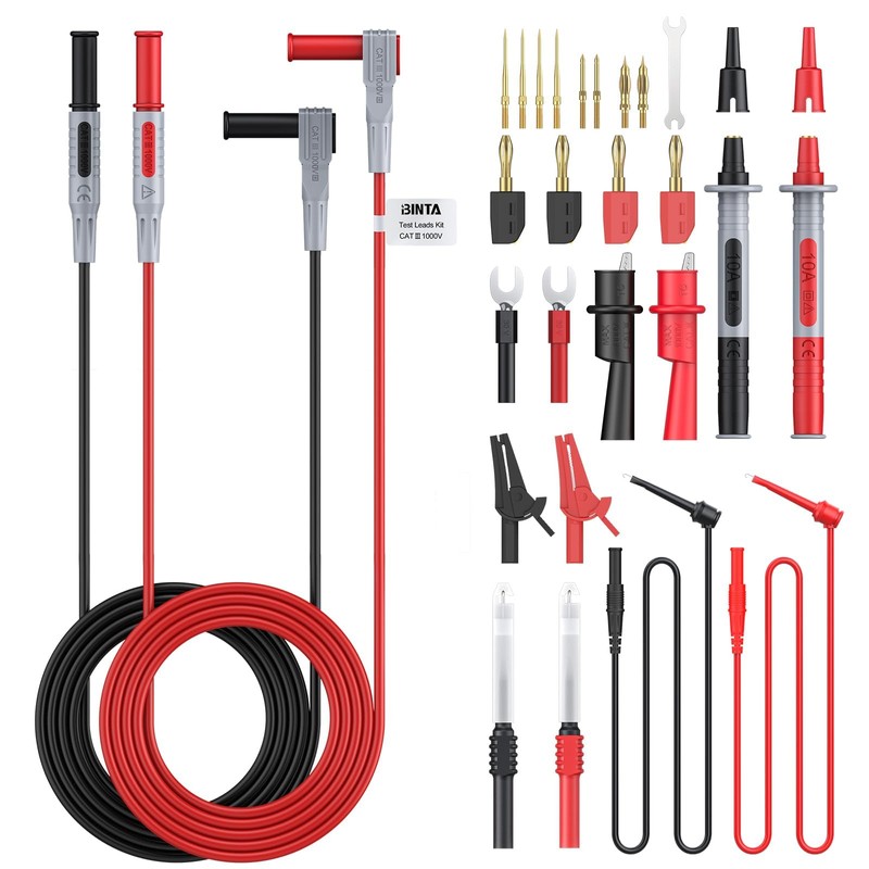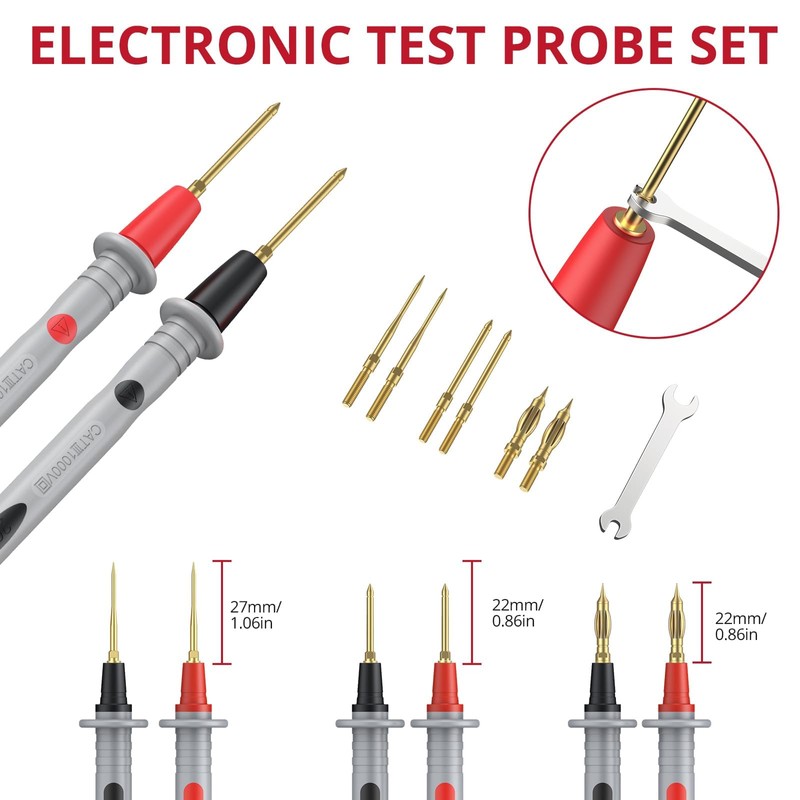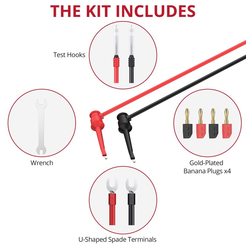 • 【Test Lead Kit Includes】2x multimeter test leads, 2x test leads pen, 4x alligator clips, 4x 1mm gold-plated probes, 2x 4mm gold-plated probes, 2x 2mm gold-plated probes, 1x wrench, 4x gold-plated banana plugs, 2x test hooks, 2x probe sheaths, 2x U-shaped adapters