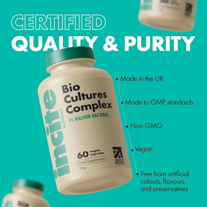 - UK MADE to GMP STANDARDS: our Probiotics Bio Cultures Complex Vegan Capsules are made and manufactured in the UK with PREMIUM INGREDIENTS to the highest of standards. They are its suitable for vegan and vegetarian. Incite Nutrition Bio Cultures Complex Vegan Capsules