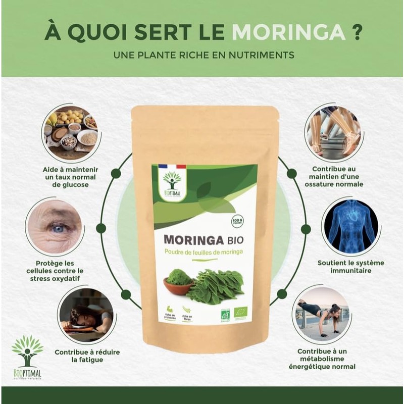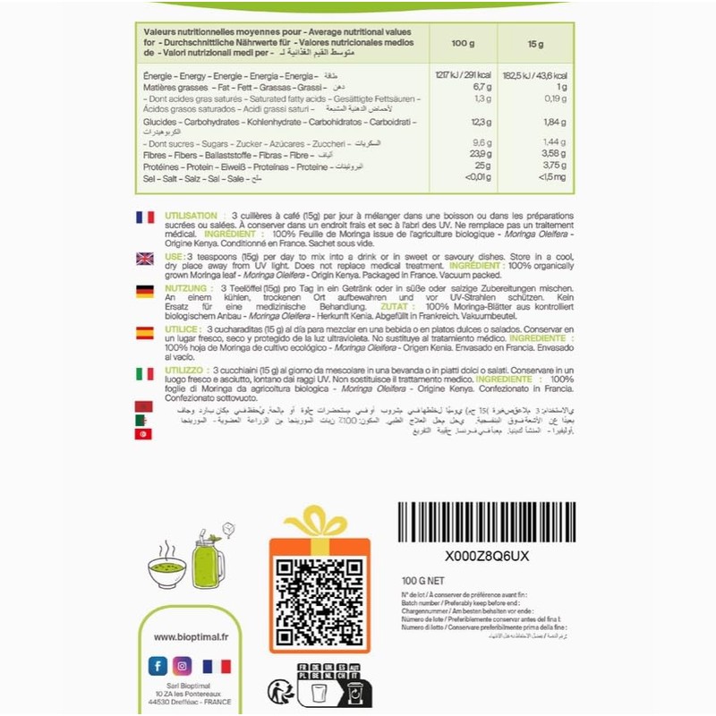 ● WIE KONSUMIERT MAN ES? Moringa-Pulver lässt sich leicht in Ihre Ernährung integrieren. In Ihrem Lieblingsgetränk mit Saft, gemischt mit Wasser in einem Shaker oder gemischt mit Obst oder Gemüse in einem Smoothie. Auch in heißen Getränken (Kräutertee, Aufguss), in Ihren gekochten Gerichten, am Ende des Garvorgangs, zur Erhaltung der Nährstoffe (Suppen) oder in Vinaigrette.