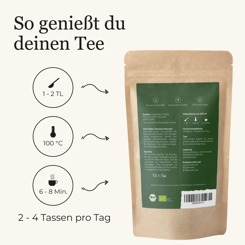 - KEINE VERSTECKTEN ZUTATEN: Bio Salbeiblätter, Bio Thymian, Bio Holunderblüten - 100 g loser Bio Kräutertee ohne Aromastoffe und ohne weitere Zusätze nach klassischer Rezeptur.