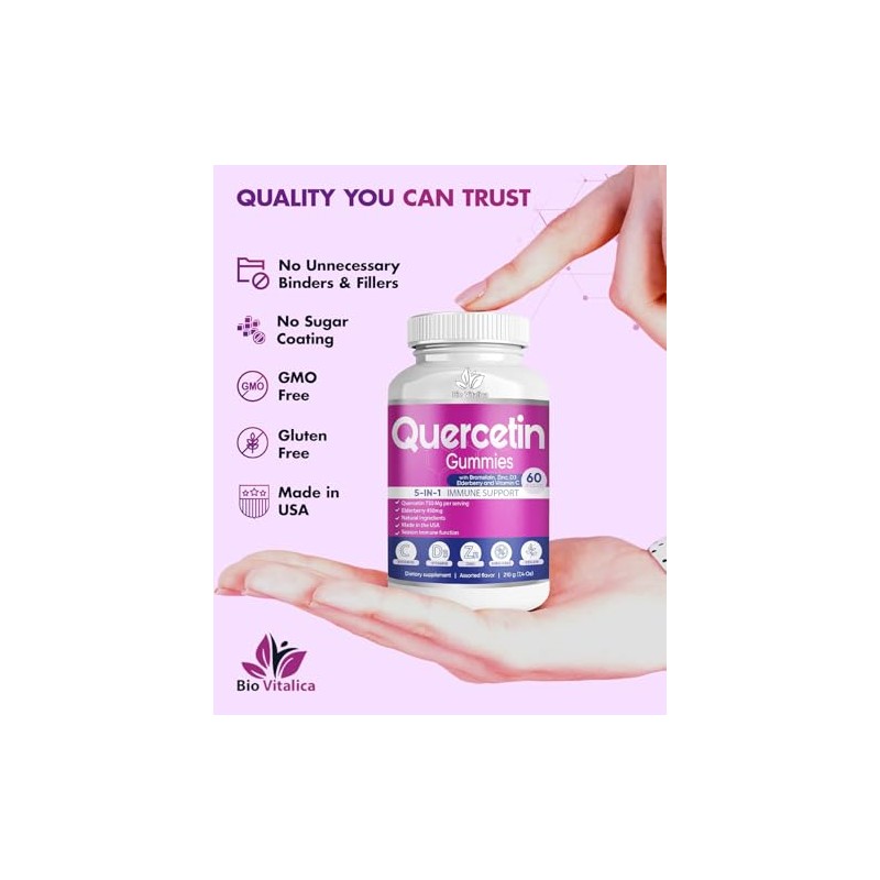 - Product you can trust. Proudly produced in the USA under the highest safety standards and 3rd Party tested for Purity and Contamination. Premium. Vegan. Raw. Organic. Gluten-Free. Non GMO quercetin supplements. 60 Gummies per jar