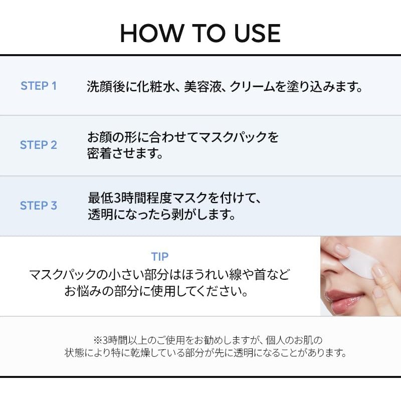 - [How to use] 1. After washing your face, use a toner to smooth out your skin texture. 2. Apply basic cosmetics such as ampoules and creams that you want to maximize absorption. 3. Carefully remove the mask pack and fit it to the shape of your face. 4. Leave it on for at least 3 hours, and when the mask pack becomes transparent, remove the pack.
