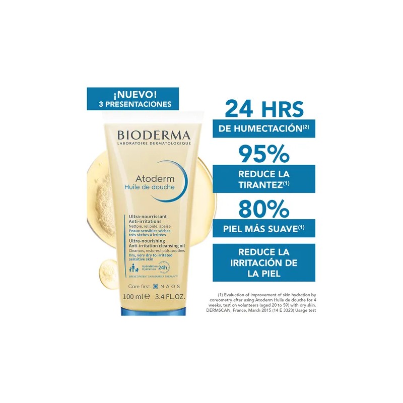 La gama de Bioderma Atoderm se ha inspirado en los tratamientos usados por dermatólogos y han desarrollado el tecnología D.A.F.™ y Skin Barrier Therapy™, ayudando a purificar la piel y previniendo la adhesión de bacterias que pueden agravar la piel seca severa. Atoderm te acompaña siempre con el Aceite de Ducha Dermo Limpiador, para piel muy seca. Su fórmula sin jabón y no grasa calma la piel de inmediato, reduciendo la sensación de tirantez en un 95% y brindando 100% de alivio y confort. Ideal para adultos, niños y bebés.