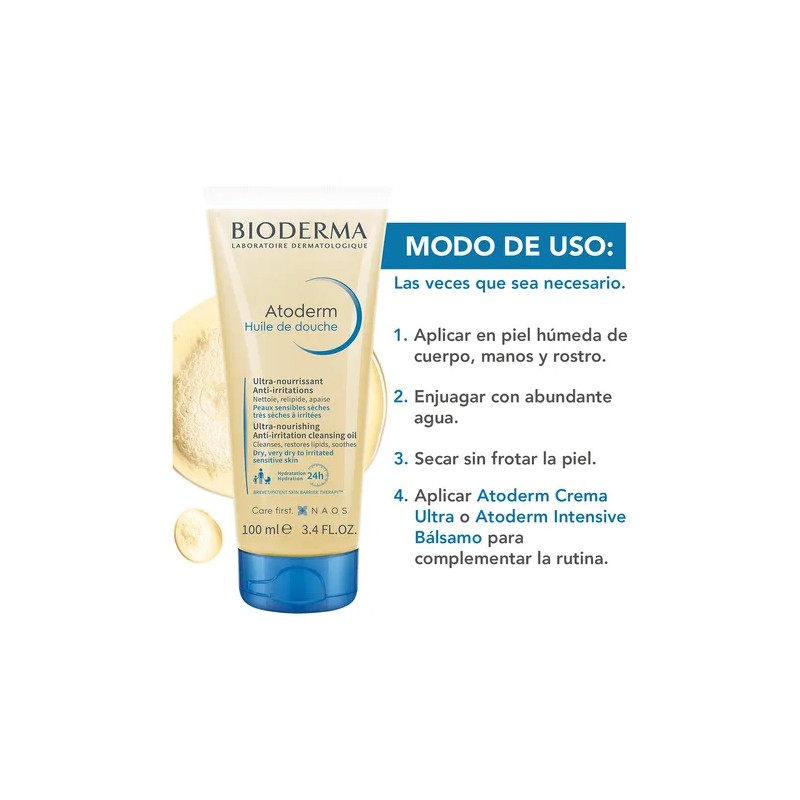 Atoderm Aceite de Ducha Dermo Limpiador es apto para adultos, niños y bebés con piel muy seca y con tendencia atópica. Aplica sobre la piel mojada, frota suavemente y enjuaga. Ideal para rostro, cuerpo y manos. No olvides consultar a tu dermatólogo.