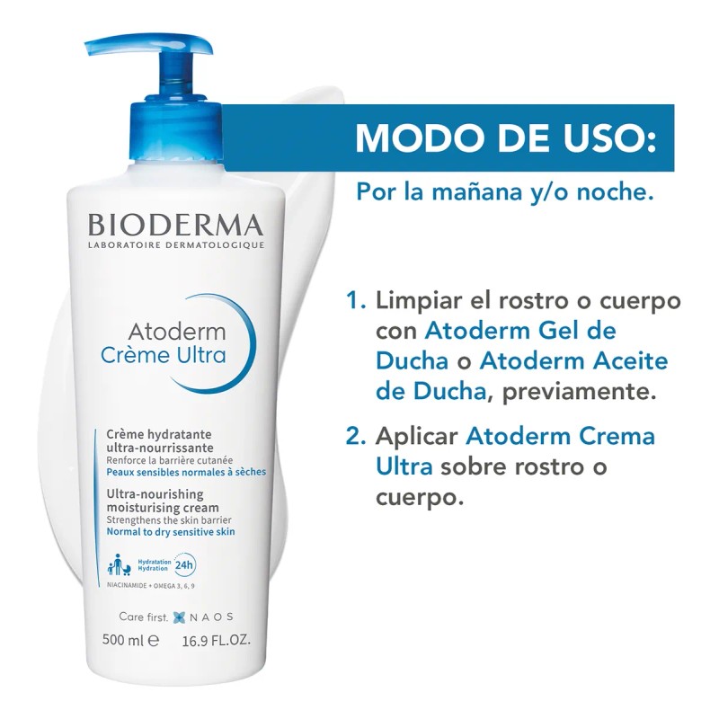 Atoderm Crema Ultra Nutritiva humectante es apta para adultos, niños y bebés con piel normal a seca y con tendencia atópica. Aplica en la piel previamente limpia, distribuyendo por todo el rostro y cuerpo hasta su completa absorción. No olvides consultar a tu dermatólogo.