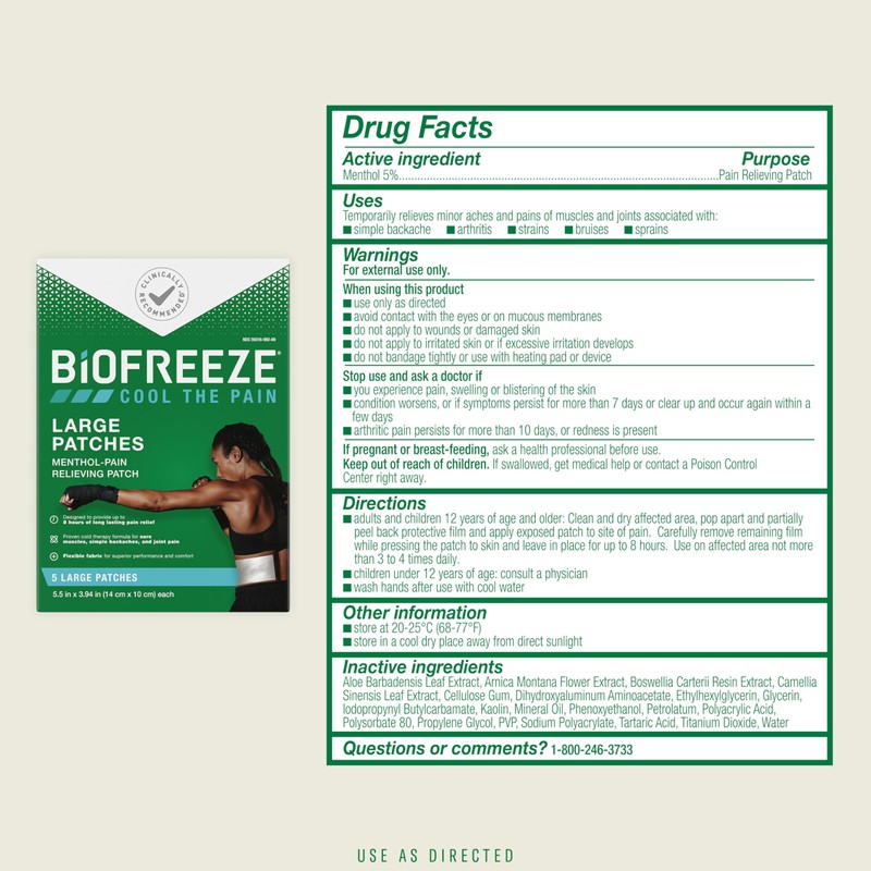 Product DescriptionBiofreeze Menthol Pain Relieving Patches with menthol-topical analgesic are designed to provide up to 8 hours Of long-lasting pain relief. Long lasting, cooling menthol formula delivers penetrating pain relief for sore muscles, simple backaches, sore joints, bruises, and arthritis. These mess-free, individually wrapped, large patches use flexible fabric for superior performance and comfort.Manufacturer Contact Information866-682-4639