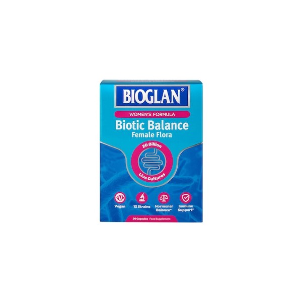 Bioglan Biotic Balance Women Capsules contains 20 billion live good bacteria from 12 specially selected strains that naturally occur in the intestinal and genital tracts of women. It is especially high in Lactobacilli, the most prevalent good live bacteria found in a healthy female body. It also contains chloride which contributes to normal digestion by the production of hydrochloric acid, folic acid which contributes to the normal function of the immune system and vitamin B6 which contributes to the healthy regulation of hormonal activity. The easy-to-swallow capsules are room temperature stable meaning no refrigeration is required.