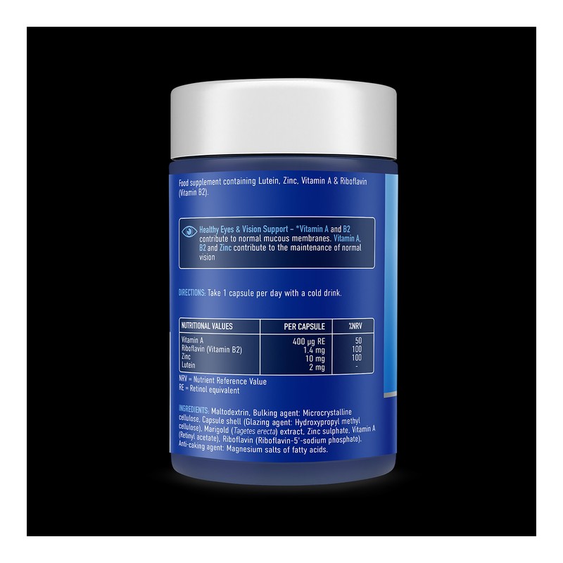 Maltodextrin, Bulking agent: Microcrystalline cellulose, Capsule shell (Glazing agent: Hydroxypropyl methyl cellulose), Marigold (Tagetes erecta) extract, Zinc sulphate, Vitamin A (Retinyl acetate), Riboflavin (Riboflavin-5'-sodium phosphate), Anti-caking agent: Magnesium salts of fatty acids.