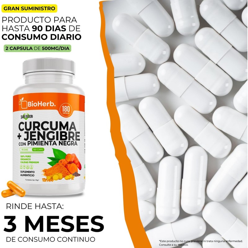 BioHerb. Cúrcuma y Jengibre + Pimienta Negra (180 Cápsulas Para 90 Días)