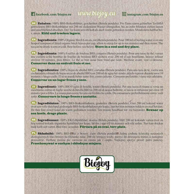 - Organic birch leaves, cut, natural organic quality, freshly cut, dried and natural packed so that ingredients and aromas are optimally protected.