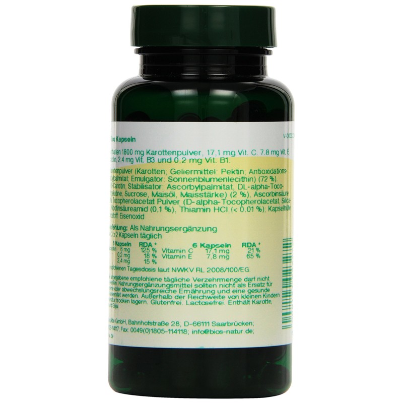 - Carrot Bios capsules contain 1 mg beta-carotene, 2.85 mg vitamin C, 1.3 mg vitamin E, 0.4 mg vitamin B3, 0.035 mg vitamin B1 and carrot powder in a hard gelatin capsule.