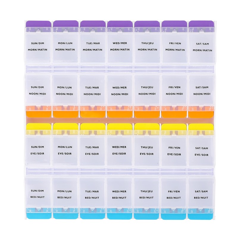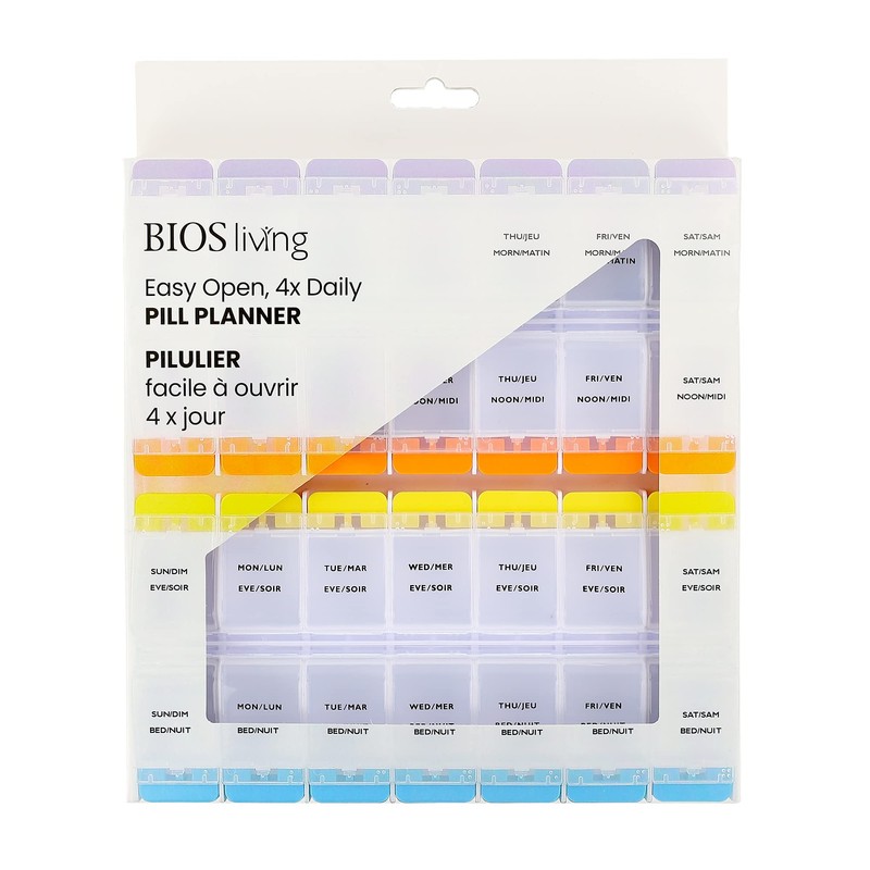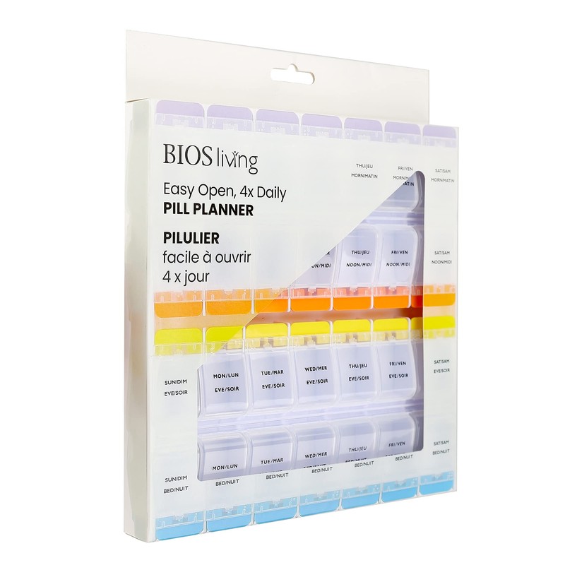 BIOS Living Easy Open Push Tabs, 4 x Daily Pill Planner, Extra Large Pill Modules, Translucent Case for Easy Identification, BPA Free, For Medication, Pills, Vitamins, Supplements, AM/PM