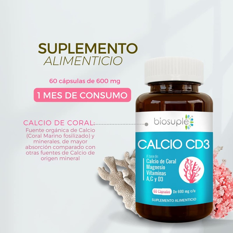 BIOSUPLE | Calcio de Coral con Magnesio y Vitaminas A, C, y D3. 60 cápsulas | CALCIO CD3 - Suplemento alimenticio