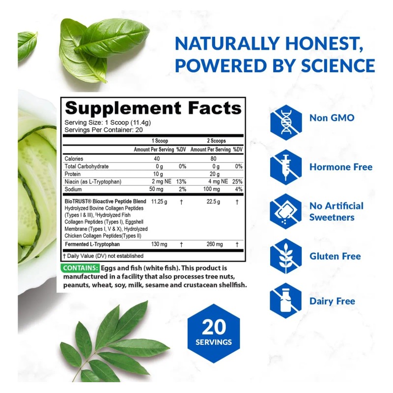 - Péptidos de colágeno bioactivos. Contiene 10 g de colágeno hidrolizado por porción para fácil absorción y formación de nuevo colágeno, con aminoácido triptófano fermentado natural, proteína completa.