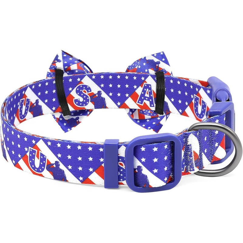 BiPawTi American Flag Dog Collar with Bowtie, 4th of July Dog Collar Holiday Pet Gift, Blue Pride Patriotic Dog Collar, USA Dog Collar for Independence Day, Memorial Day, Flag Day - M