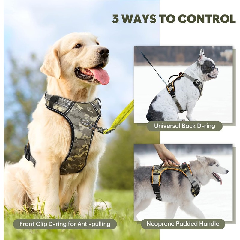 - 【3 Ways to Control】1. No Pull Dog Harness D-Ring on the front clip - if you attach dog leash to this D-ring, they will turn around instead of pulling you forward when they pulls. After several trys, they will learn not to pull. 2. Universal back D-ring - often used after dog learns not to pull. 3. Neoprene Padded Handle - Powerful control by hand, or when you need to pick your dog up.