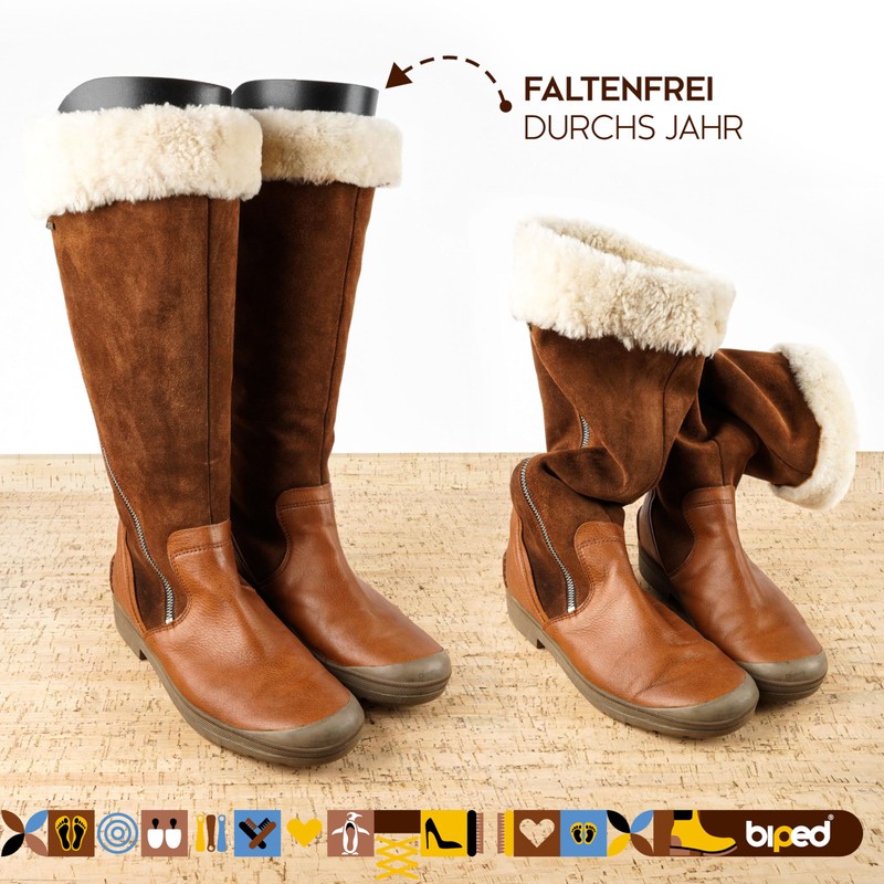 Our boot stretchers preserve the shape of your boots without widening or over-stretching them. They ensure that the boots stand stable, do not tip over and the shaft does not slip down or bend. This protects leather and zips. The shaft shapers smooth wrinkles and prevent cracks. In addition, the boots can ventilate better and dry faster, which contributes to the hygiene and durability of the shoes.