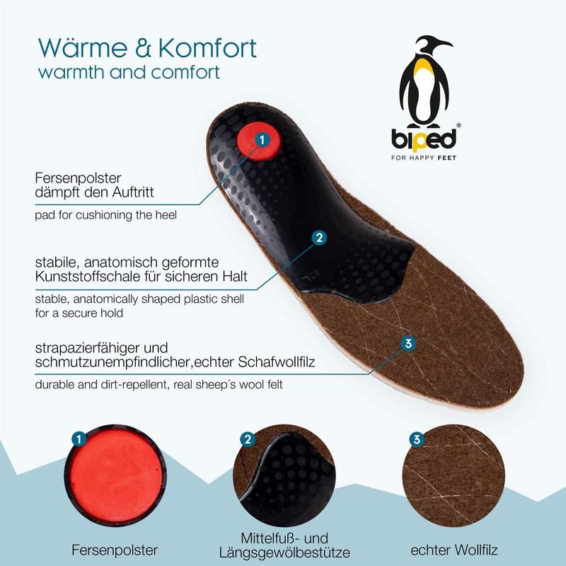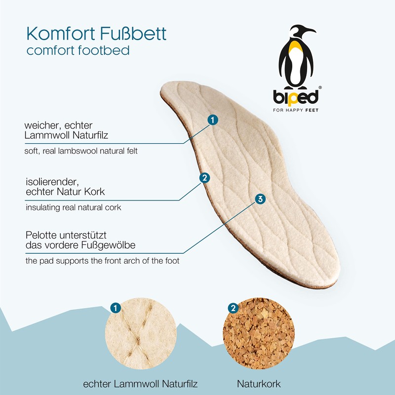 - biped Footbed made of real wool felt and natural cork reliably protects against rising cold floors