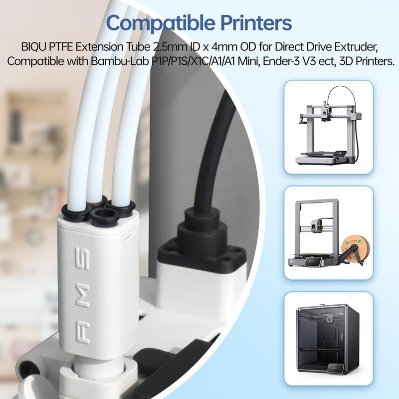 - Designed for Direct Drive Extruder 3D Printer: BIQU PTFE Extension Tube Designed for Direct Drive Extruder 3D Printers. Compatible with Bambu-Lab P1P/P1S/X1C/A1/A1 Mini, Ender-3 V3 ect,.