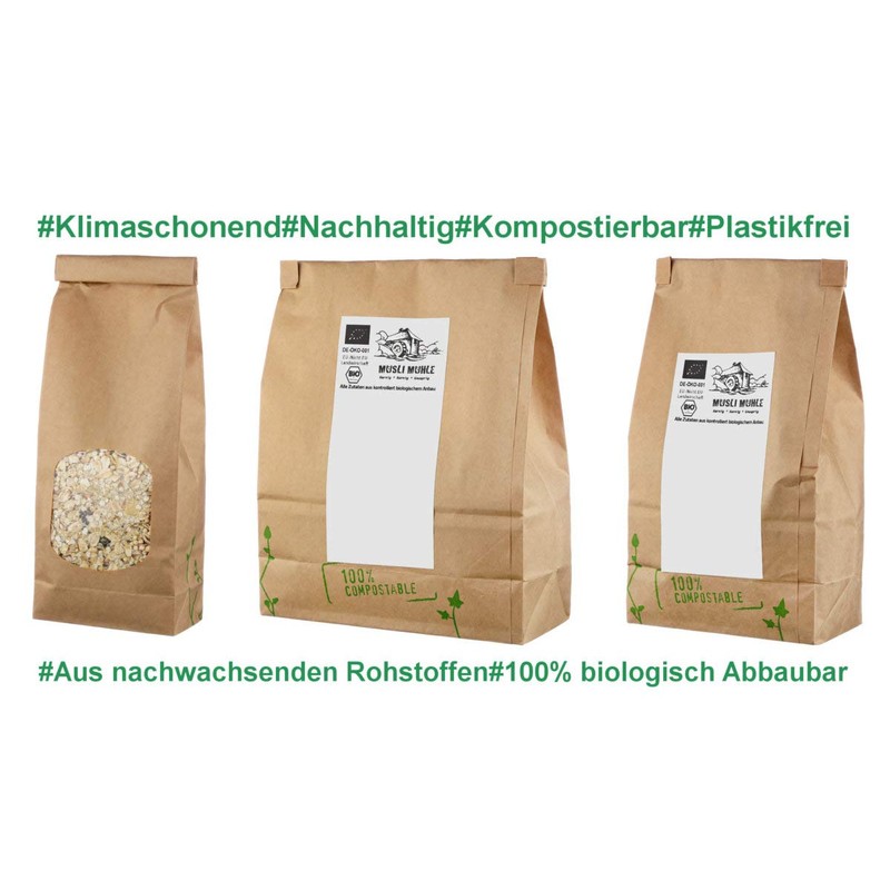 Wir legen genauso hohen Wert auf eine nachhaltige Verpackung, deswegen setzen wir bei unserer Müsli Verpackung zu 100% auf kompostierbare Beutel. Wo immer es möglich ist, verzichten wir auf Plastik, damit leisten wir einen Beitrag, um die Belastung auf die Umwelt und die Meere durch Plastikabfälle zu verringern.