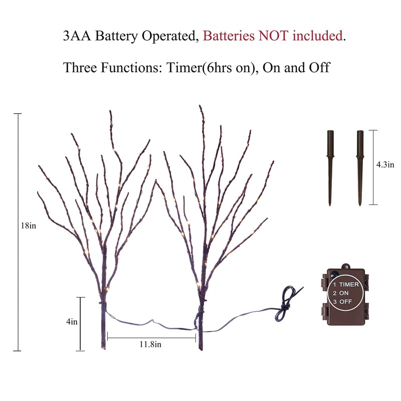 - 【LIFELIKE IN APPEARANCE】: Hand painted with realistic natural brown bark-inspired finish on the twig lights. IP44 waterproof and 2pcs ground stakes included for taller vase use or outdoor patio, porch, birthday party, wedding or events celebrations decor