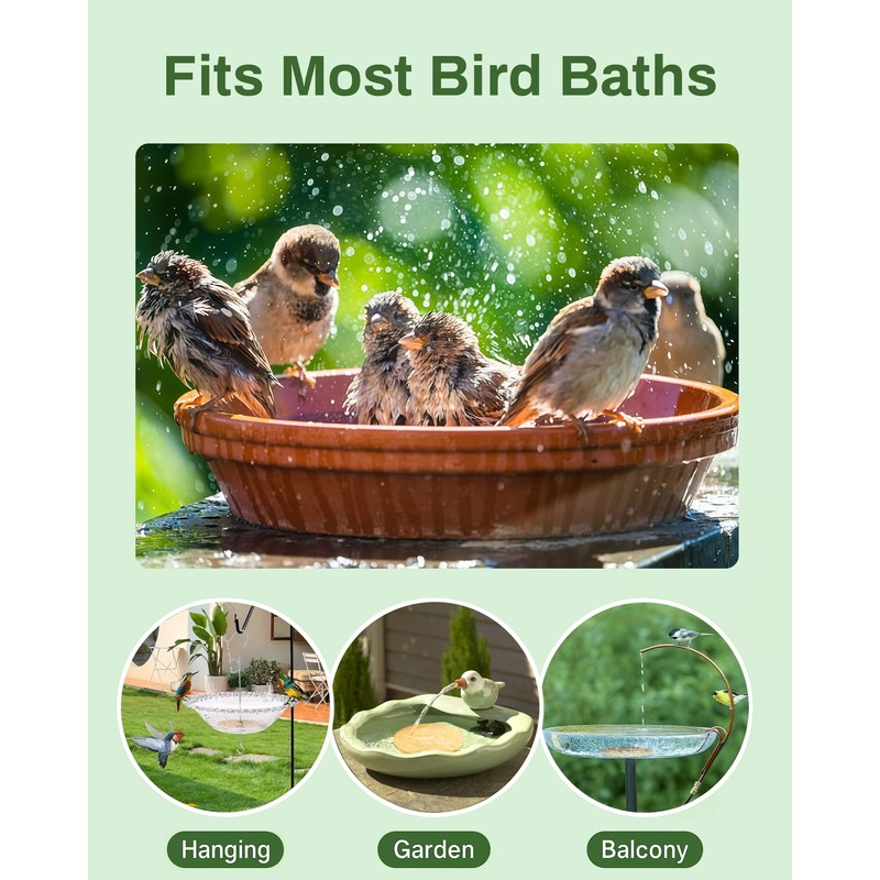 - Fits Most Bird Bath Setups – Ideal for use in glass, ceramic, stone, metal, or plastic birdbaths. Complements hanging bowls, pedestal stands, railing mounts, or ground setups.