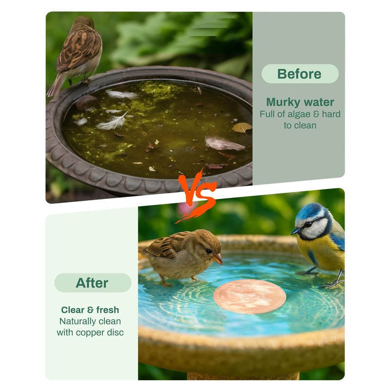 - Pure Copper Construction – Made from high-quality pure copper, this purification disc naturally helps maintain cleaner bird bath water without the need for chemicals. Durable, rust-resistant, and safe for birds.