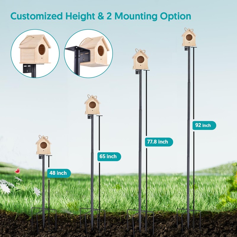 - Flexible Height Adjustment & Quick Installation - With 5 poles you could adjust, each poles measures 16.5inch, the total poles height can reach to 92 inch, you could adjust the pole quantity to meet the desire height to suit your needs without any tools. Beside with bird house mounting needing tools, follow our instruction, connected each parts one by one,easy to assembly and without any tools.