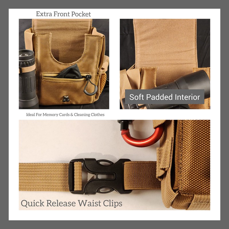 Four point shoulder harness with carrying case for medium and small binoculars. Includes three pockets and a soft case interior as to not damage the lenses. Strong polyester construction offers durability through any climate while the light weight design with sweat wicking technology ensures you can be there comfortably for as long as you want.