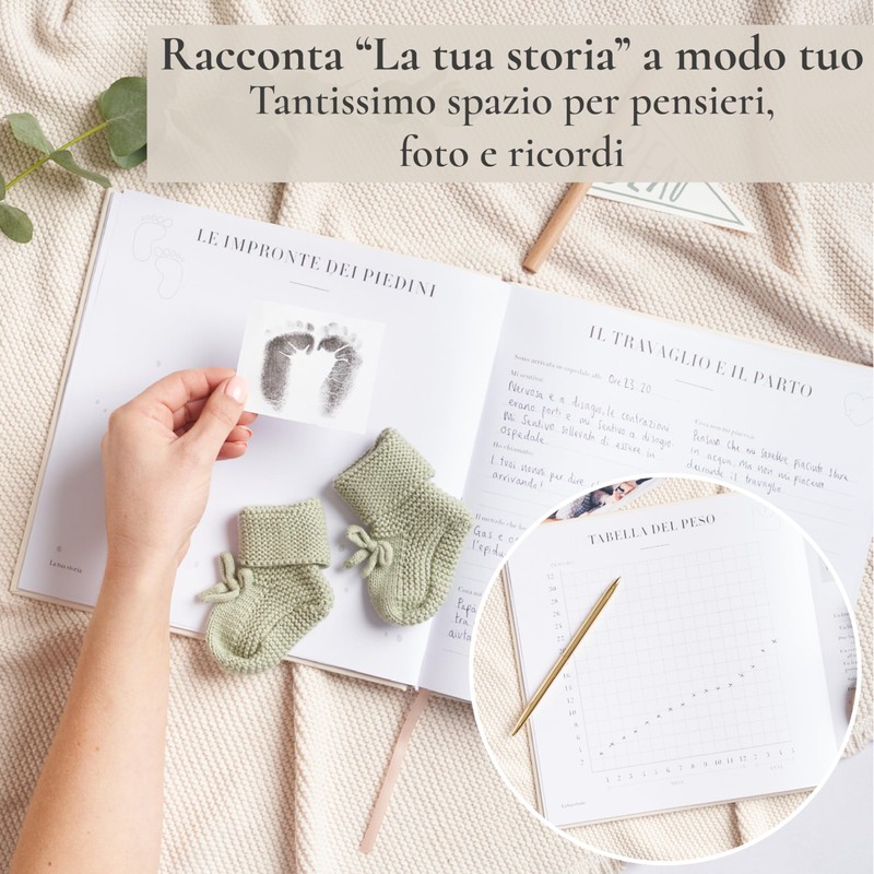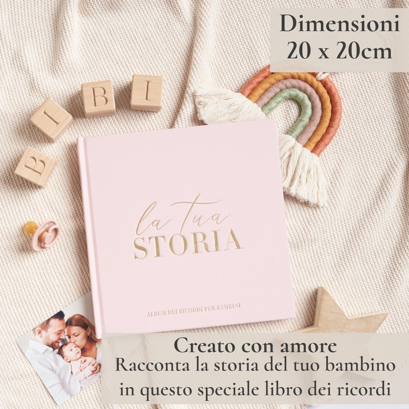 - Main information: 132 pages, pocket, suitable for photos in 10 x 15 cm and 13 x 18 cm. From birth to 5 years. Sections include: the choice of name, family tree, mom, dad, baby shower memories, labor, height and weight chart, the day you were born, house sweet home, the first weeks with you, your first year, hand and footprints, 1-2-3-4-5 years, your first day of school, and our favorite memories. Size: 21 x 21 cm