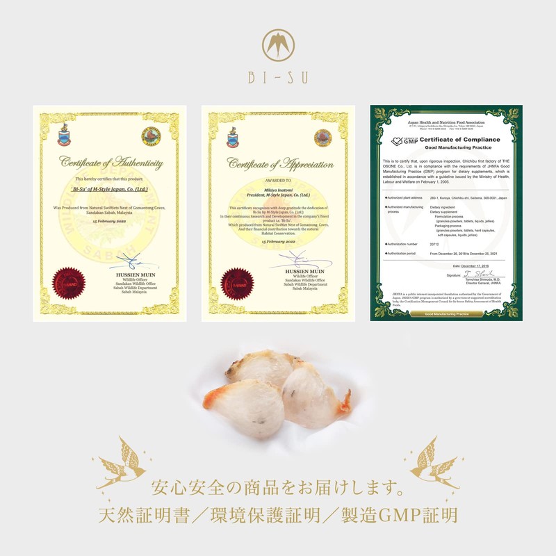 - 【ハイレベルな品質と抽出技術!】滋養・美容成分がたっぷり含まれた「天然アナツバメの巣」を使用。その力は養殖のツバメの巣と比べても豊富で「シアル酸」の含有量も格別です。BI-SUは本物のアナツバメの巣を採取し、独自技術により高濃度エキスを抽出することに成功しました。市場に出回る多くの粗悪品や偽物と区別するため、BI-SUはマレーシア政府が厳重に管理する巣のみを採取し、「100%天然」のアナツバメの巣を皆様にお届けいたします。