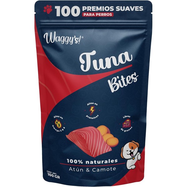 Descripción: Detalles del Producto: | Marca: Waggys | Sabor: Atún Perros | Rango de edad (descripción): Todas las etapas de la vida | Forma del producto: Trozo | Ingredientes especiales: Cúrcuma, Camote | Cantidad de unidades: 100 gramo | Número de artículos: 1 | Información del paquete: Bolsa | Peso del producto: 100 Gramos | Recomendación de raza: Para perros y gatos