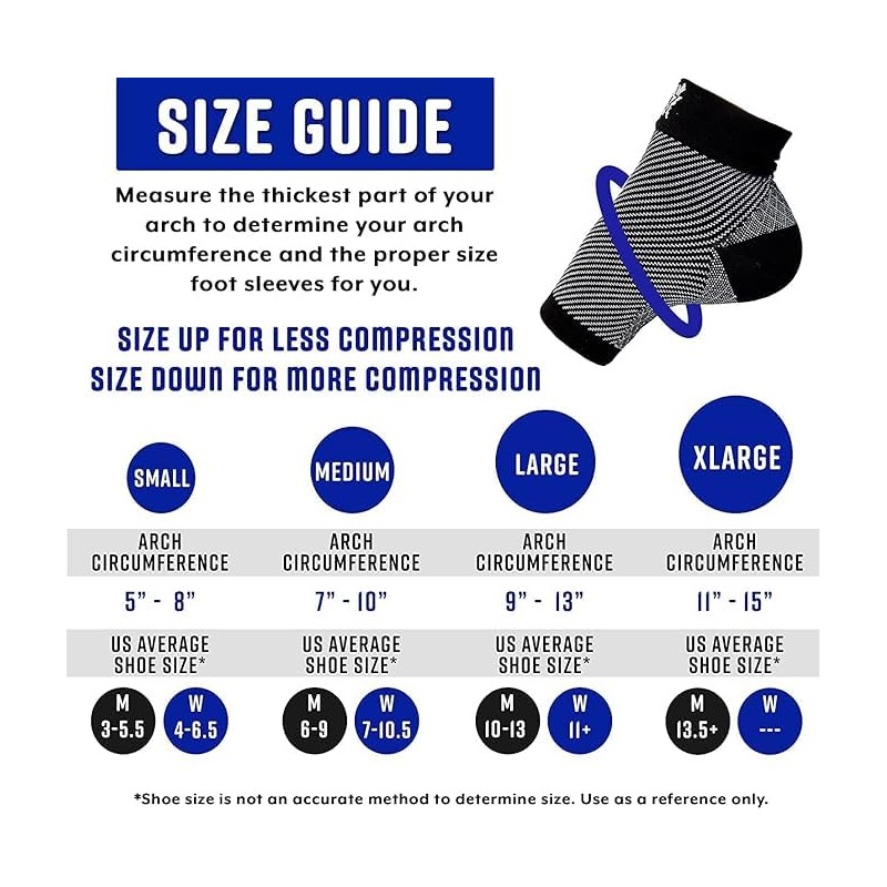 • Find the Perfect Size: Look at our size chart (4th image) to make sure you get the perfect fit. We recommend that you use your arch circumference versus using your shoe size. This will allow our socks to work best for you.