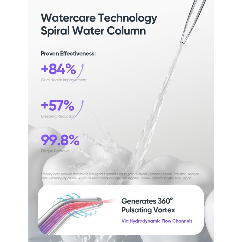 - Excellent Performance for Teeth Cleaning - bixdo proprietary WATERCARE generates 1,500 micro-pressure waves per minute, creating a targeted dual stream that eliminates 99.8% of residual debris and plaque. Four adaptive modes (including GUMCARE for sensitive gums) features for deep and effectively cleaning between the teeth, gums and braces