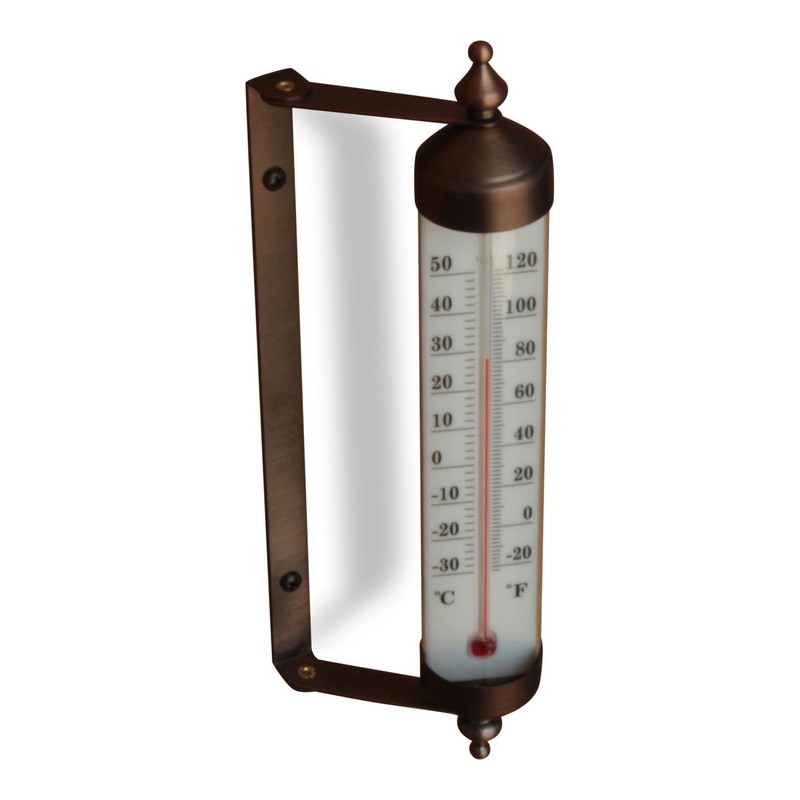 This simple, attractive tube shaped outdoor thermometer can mount on a wall, fence, window or windowsill of your house. It adjusts to the left or right so that you can set it at the best angle for viewing indoor or out. The frame and ends of the thermometer are made of steel, for durability, with a bronze finish on the thermometer top and bottom, and a dark finish on the mounting bracket. Vertical height is 10 inches, tip to tip. The clear optical plastic portion measures 6 1/4 inches in height. Includes 2 screws for mounting. This will become one of your favorite home thermometers once you see it in your garden, deck or patio. See the weather before you go outside.