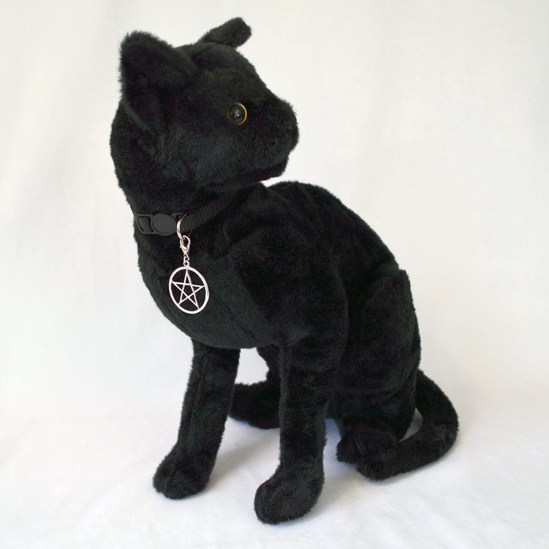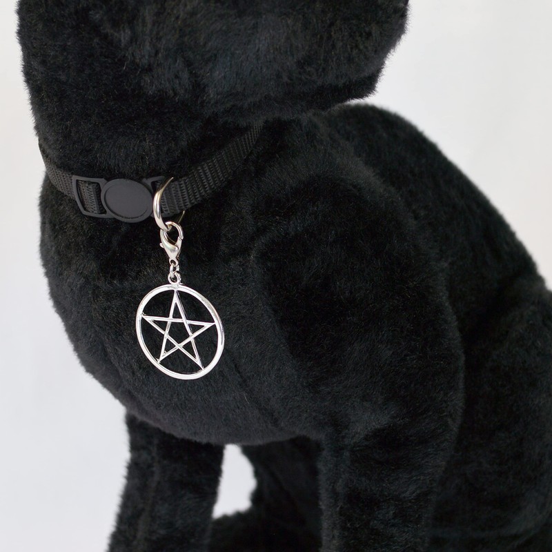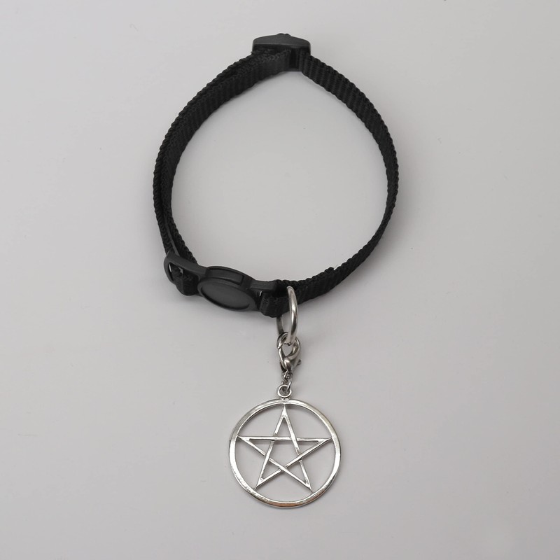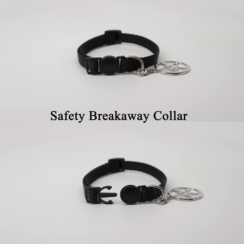 Black Cat Collar with Wiccan Pagan Pentacle Silver Finish On Safety Breakaway Collar Adjustable Neck Size 8 to 12 Inches