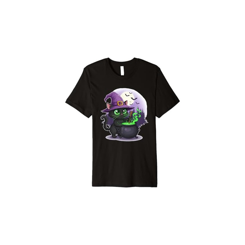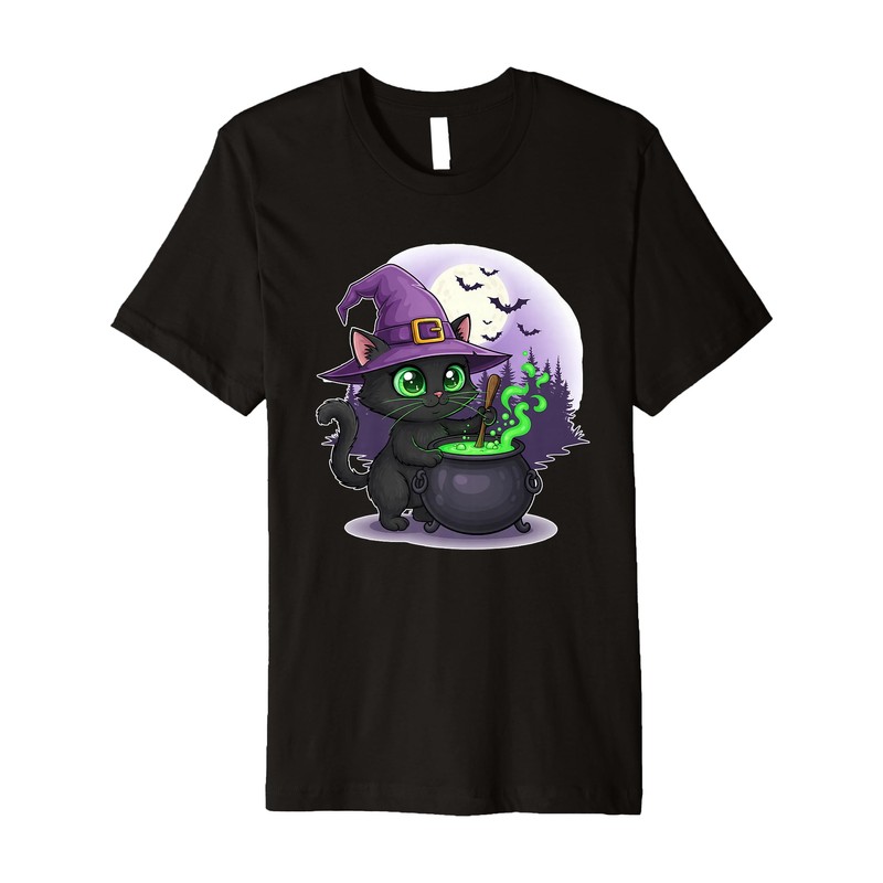 Black Cat Witch with Cauldron and Moon Premium T-Shirt
