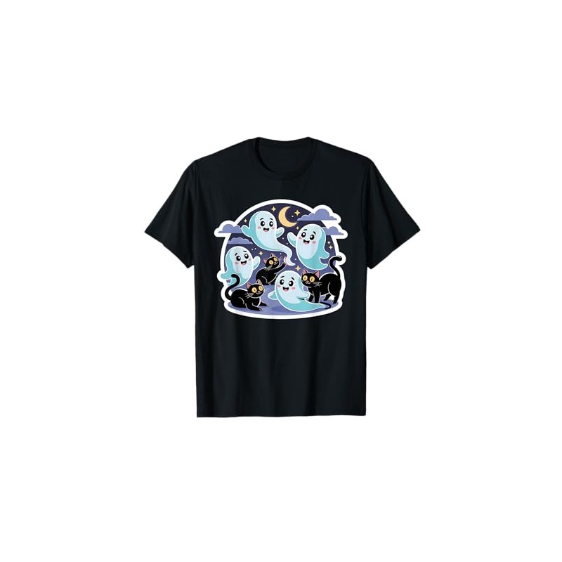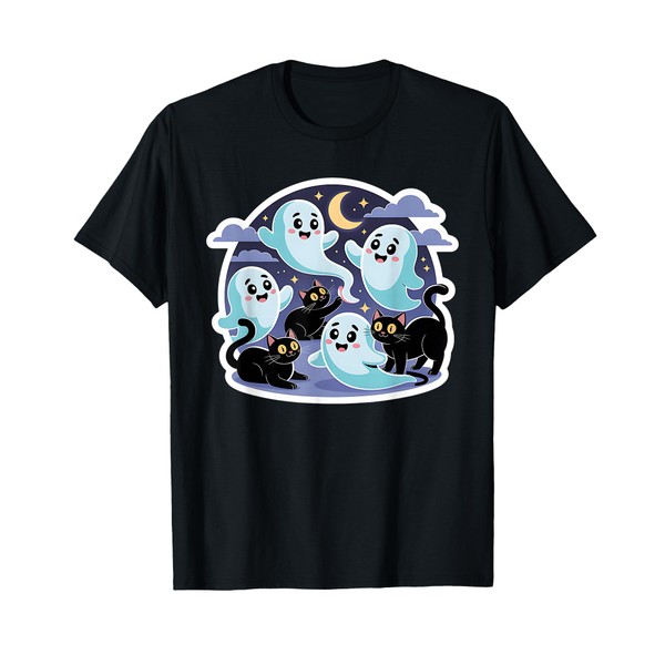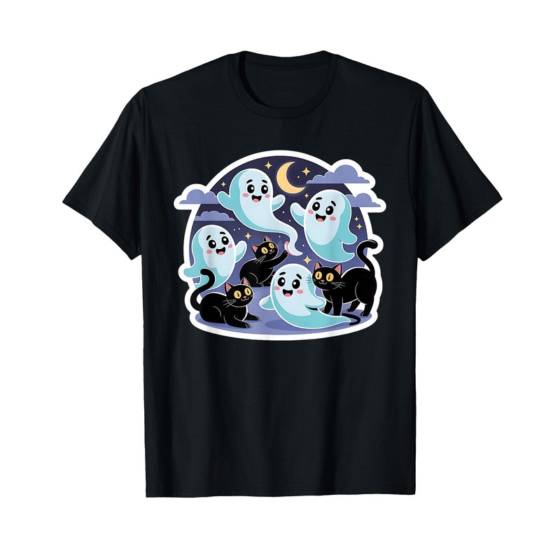 Black Cats with Cute Ghosts - Family Friendly T-Shirt